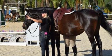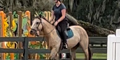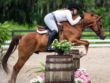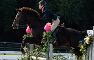 16.3 H. Hanoverian mare. She is a former National 3', 4-H Winner along with numerous Championships at horse shows around Florida. We call her our big confidence builder. She's a patient school master and wins every ones heart from Crossrails to Modified.